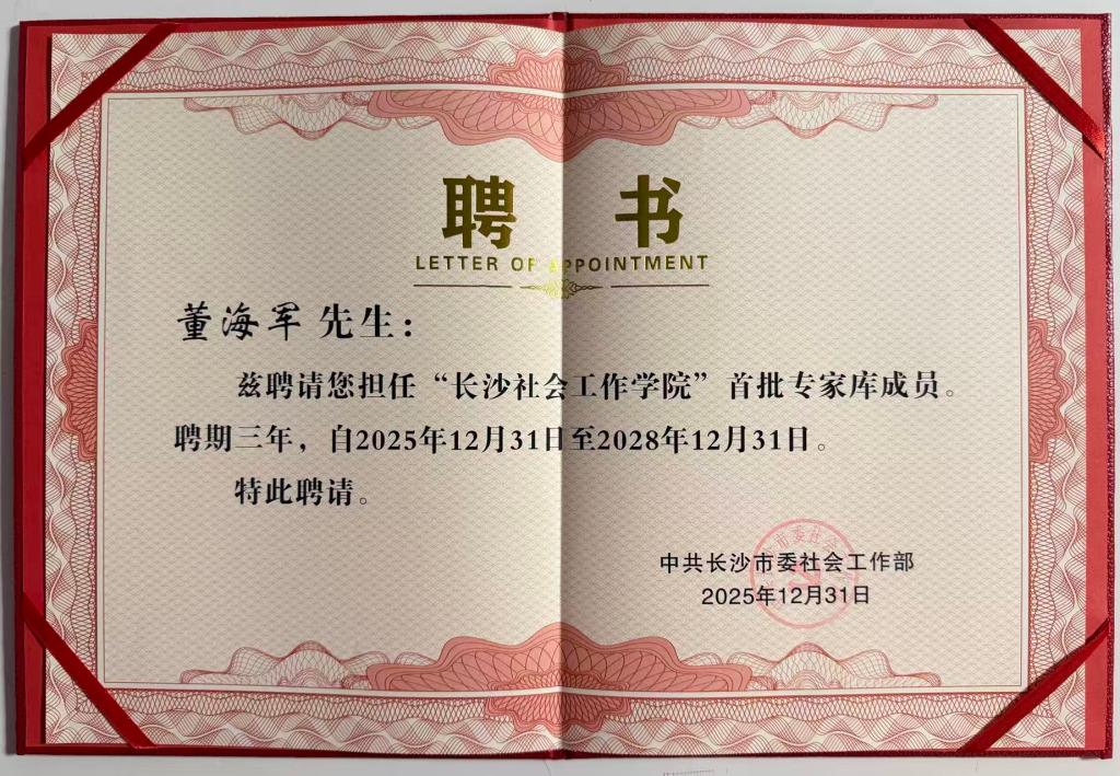 2025年12月31日,由中共长沙市委社会工作部主办,长沙晚报社、长沙开放大学承办的“长沙社会工作学院”首批智库专家受聘仪式在长沙开放大学举行。我中心主任董海军教授获聘为首批智库专家。