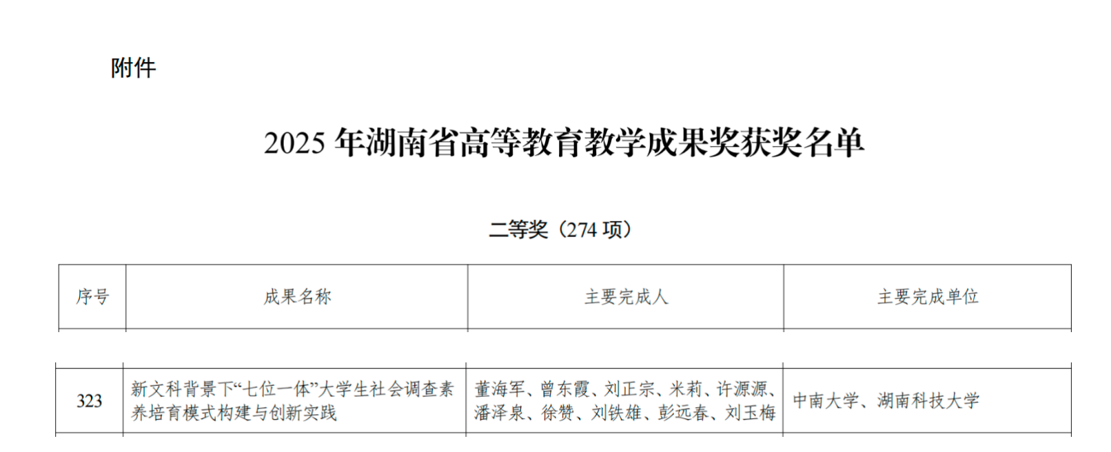 湖南省高等教育教学成果奖是省内高等教育领域层次最高、影响力广泛的重要奖励,代表了当前教育教学改革与实践创新的先进水平。此次获奖,是对我中心多年来扎根新文科建设前沿,致力于创新人才培养模式、系统性提升学生社会调查核心素养所取得成效的充分肯定。